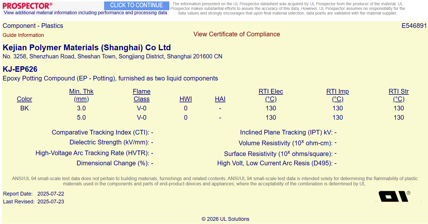 KJ-EP626 双组份环氧灌封胶UL证书: