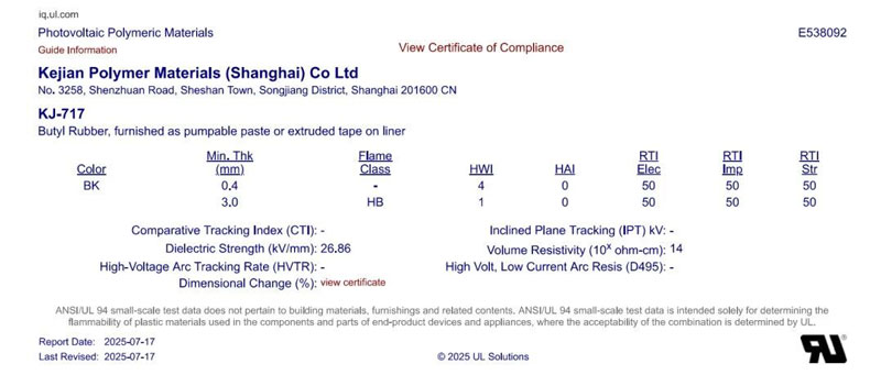 KJ-717 封边胶带UL证书: