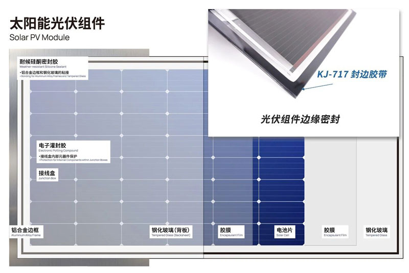 • KJ-717封边胶带具有较好的防水汽、耐UV、耐高低温和绝缘性能; • 胶体透水率低,可大幅提高光伏组件的使用寿命; • 表面能低,通常不需要底涂就能对玻璃,金属和通用塑料等有优异粘结性; • 在150-180℃下有较好的加工性能,可用于热熔胶机在线涂布,也可挤出成胶条再使用。 • 适用于太阳能光伏组件的内部层压密封粘接,可有效保持钙钛矿组件、异质结组件等产品的输出功率。